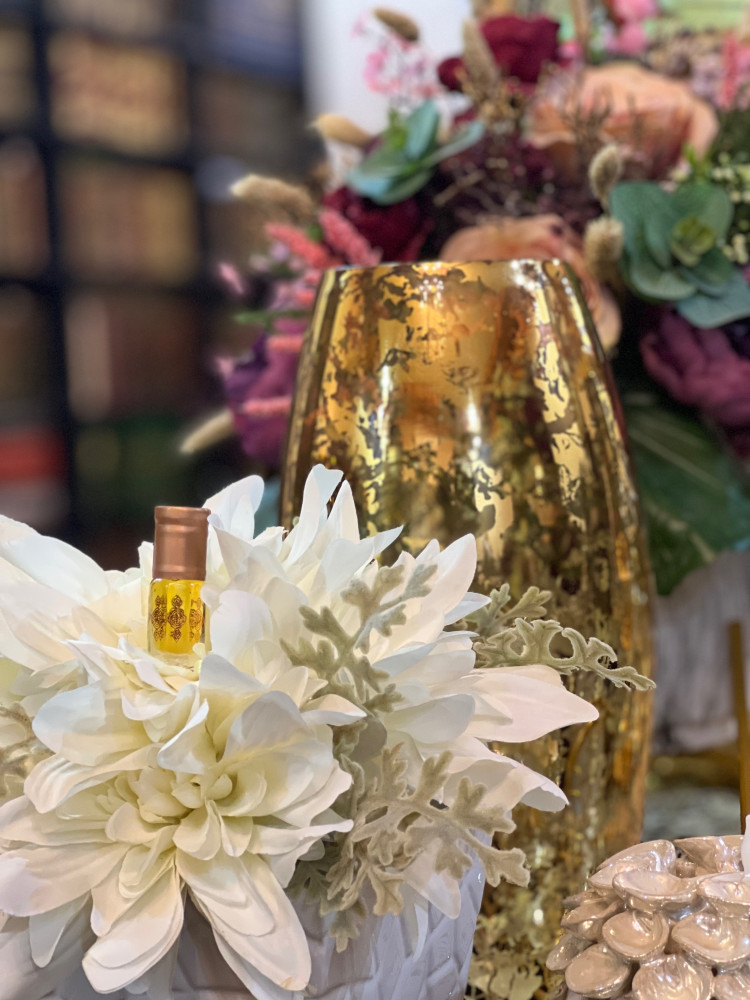 مزيجٌ من الأحاسيس والمشاعر النبيلة سُكبت في زجاجة رشيقة، تنبض بالزعفران والورد ونسمات السَّحَر✨🌿
