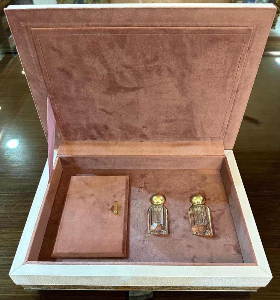 تضُمُّ في داخلها أوقيَة من أفخر الأعواد الإريانيّة العطريّة الزاكية، وربع تولة من العود الممزوج بالحُب والوُد والجمال، في كرستالة أنيقة تليق بكل غادةٍ رقيقة، وميّادةٍ شفيقة🌿🕊